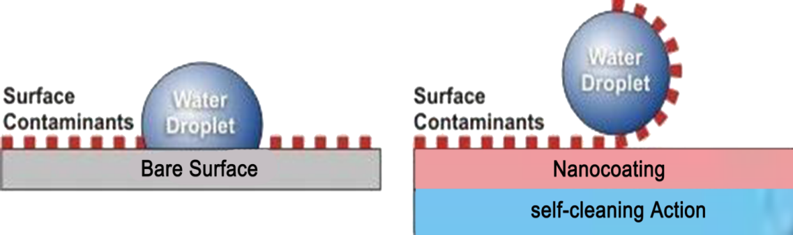 近年来,随着人们对生活质量要求的不断提高以及环保和节能意识的不断增强,具有自清洁功能的表面得到了迅速的发展。疏水自清洁玻璃涂料是在漆膜表面引入低表面能的物质,如有机硅、有机氟和有机氟硅烷。这些物质分子体积大,内聚能密度低, 分子间作用力小,因而表面能很低,具有良好的憎水性。疏水自清洁玻璃纳米涂料无色透明,表面张力低,接触角大于120度,水在物体表面犹如在荷叶上一样滚落而不留水迹,能有效延长保洁时间,具有防水、防雾、防雪、防污染、抗粘连、抗氧化、防腐蚀和自清洁以及防止电流传导等重要特点,在科学研究和生产、生活等诸多领域中有极为广泛的应用前景,可普遍用于农牧业、军用、工程建筑、交通出行、纺织业、诊疗、防腐蚀及日常日常生活等行业。
