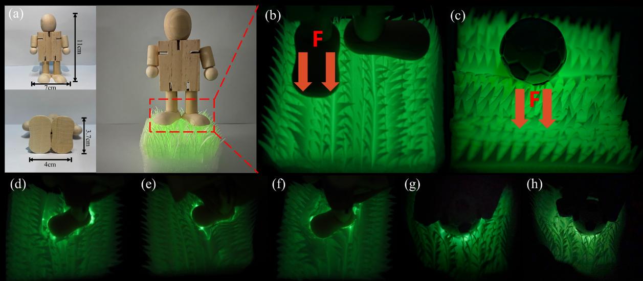 本项目是一类基于应力发光智能/节能材料制作而成的复合人工发光草坪,在不需要激发光和电源的条件下,通过踩踏发光。具有传统的发光草坪和类似的路面发光标记所不具有的独特功能——靠踩踏力发出可见光,能够将人的行走轨迹用环保的方式进行可视化,在运动场景,娱乐场景,一踩一发光,无需电源,可重复使用,能起到极佳的显示和美化效果,自身的余晖可以起到美化,路面指引的作用,极具时尚科技感。这种新型人工草坪在具有节能环保的特性,低成本,使用场景广阔等优点的同时,可以设计成天然材料的外观,和现有的LED照明系统进行混合铺设。既能实现节能减排,也能极大地增强时尚和娱乐效果,适合在公路、步行街、球场、公园以及室内或地下暗光场景使用和推广。