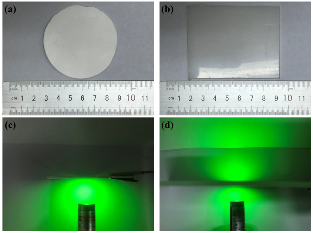 (a,c)辐射制冷薄膜材料及可见光全反射;(b, d)普通薄膜材料及可见光反射差