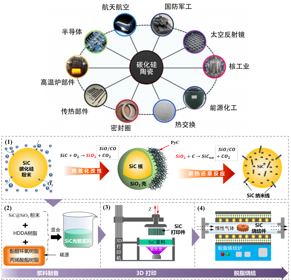 图1高性能碳化硅器件应用场景及本项目3D打印技术流程图