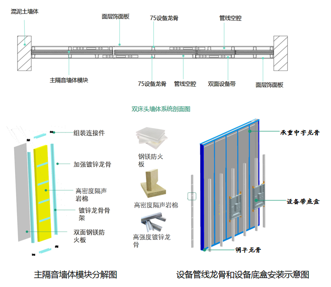 集成装配式隔墙系统是深圳市壹智造科技有限公司自主研发的一种新型装配式隔墙系统,产品是以主隔音墙体模块作为隔音保温墙体,两边设置设备龙骨模块,再干挂/拼装/粘贴饰面板实现医疗设备功能安装需求的高集成装配式医疗墙体产品。由天地龙骨模块、主隔音墙体模块、设备龙骨模块、饰面板模块等部品构成,其隔音主体以玻镁防火板、高密度隔热岩棉、高强度镀锌龙骨原材料、调节角等物料复合集成,采用框体式架构及双组份结构胶经过冷压成型的一体化墙体。是一种可工业化制造的低碳、轻质、绿色环保的新 型建筑材料,其每平方克重只有45KG,具有良好的耐火、防火、防潮、隔音、隔热等性能。