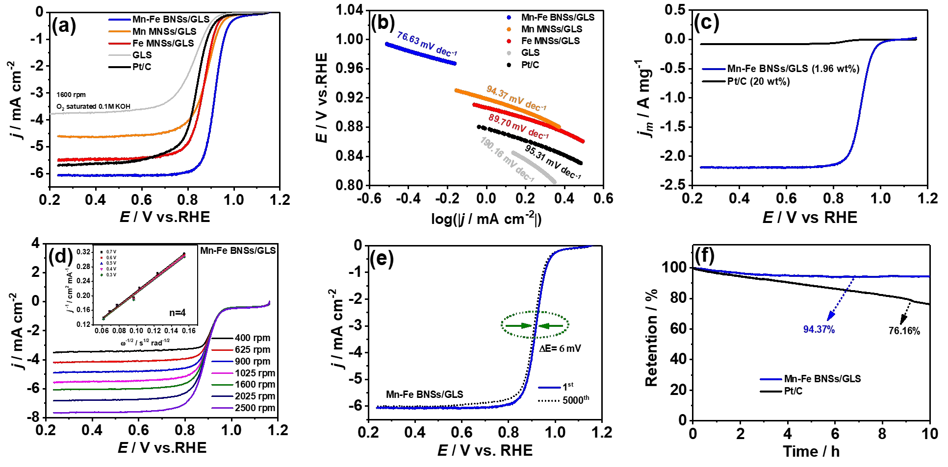 图2 类石墨烯负载的MnFeN8双核原子对催化剂的氧还原反应性能表征结果