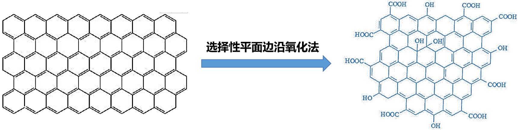 采用选择性平面边缘氧化法制备单原子层平面边缘氧化石墨烯,能够保留石墨烯优异的物理、化学性质的基础上增加其极性,大幅提高其在多种不同极性溶剂中的分散能力,大幅拓展了石墨烯的应用领域。
