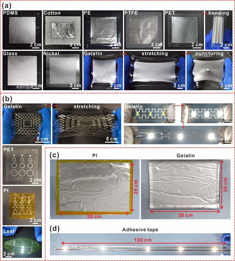 镓及其合金是一类熔点低于室温的液态金属材料,同时具备液体的高流动性和金属材料的高导电和导热性能,在柔性电子和热管理等领域有潜在应用价值。本技术发明了一种明胶凝胶辅助液态金属液滴沉积方法,可以将液态金属均匀沉积和铺展到各种柔性基底上。这种液态金属薄膜具有高拉伸率(900%的应变)、高机械稳定性、高导电性(4.35 × 105 S/m),对各种基底都有较强的粘附作用。由于明胶凝胶粘接层的存在,该方法可以将液态金属和图案均匀沉积和铺展到各种类型的基底上,包括:塑料薄膜、织物、金属薄膜、玻璃、树叶等。该方法还可以制备尺寸为280 mm × 200 mm的大面积液态金属薄膜,以及长度达到1000 mm的液态金属导电胶带。该液态金属薄膜还可用作柔性可拉伸的均热和散热界面,即使在弯曲和拉伸状态下,该液态金属薄膜仍具备良好的热传导性能和散热效果。