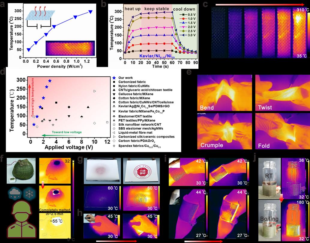 导电织物和可穿戴电子器件很难在遭受机械破坏、高温等恶劣环境中保持稳定,这限制了导电织物的应用场景。本技术发明的金属化凯夫拉织物的抗冲击性能大幅度增强,落锤冲击力增加了2~3倍。该金属化凯夫拉织物具有超高的机械强度和机械稳定性,拉伸强度达到1 GPa以上,而且拉伸断裂应变小,在受到拉伸、弯曲、胶带粘揭、洗涤、刀划、刀刺、剪刀剪等破坏后的导电性依然保持良好的导电性。该金属化凯夫拉织物还具有阻燃性和耐热性,镀镍样品在300 ℃加热1小时电阻保持稳定。该金属化凯夫拉织物可用焊锡焊接。基于镀镍凯夫拉织物优异的热稳定性和阻燃性,可用于柔性高温热电热器,仅需接通3.5 V的直流电,该电热器的表面达到接近300 ℃的高温。这种高强度强、耐高温、可焊接的导电织物有望应用于各种恶劣环境中,如交通、军事、航空航天领域等。