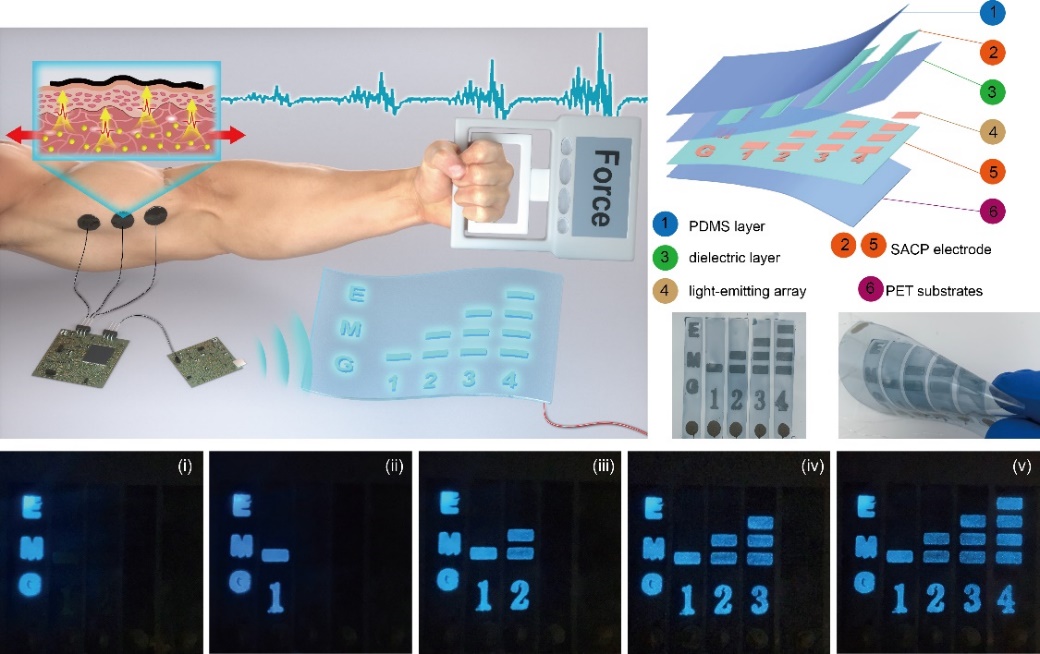 柔性电子学作为一门新兴的学科,在健康医疗、可穿戴设备、柔性显示、生物电子、机器人、人机交互系统等领域具有广泛的应用前景。 然而,在实际使用过程中,较弱的表界面结合力和错配的机械性能,容易导致器件的失效。该研究中周学昌教授课题组在传统硬而脆的导电聚合物(PEDOT:PSS)网络中引入超分子,制备了低模量(56.1-401.9kPa)、高拉伸率(700%)、强界面粘附力(lap-shear strength >1.2MPa)、高导电性(1-37 S/cm)的界面材料。该材料具有优良的加工性能。研究人员通过采用打印、旋涂等溶液法加工技术,成功制备出了自粘附、可转移印刷的柔性电路和高透明的可粘附柔性薄膜电极。基于该自粘附柔性电极,研究人员通过采集肌电信号,对各类健身运动的强度和类型进行了系统分析,并结合柔性发光器件开发出了一套集成了肌肉训练的肌电信号采集和可视化展示的实时监控系统,为日常健身运动的强度和安全性评估提供了解决方案。