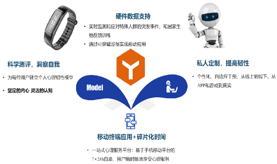 青少年的心理健康问题以及由此引发的学习困难现象以及自杀问题,已经成为很多家庭和学校急需解决的关键痛点。从个体角度出发,心理健康问题的根源所在是心理韧性,也是进行干预的最佳靶点。本项目基于手机/平板(APP、小程序)平台,以认知/情绪训练(包括游戏)为主要干预内容,以可穿戴形态(采集外周生理和脑功能数据)手环和耳机为辅,由此实现移动自助服务,对心理韧性开展个性化、自适应干预;项目后期将投入机器人形态,增强趣味性和交互性,实现对个体的陪伴式成长。