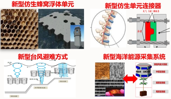 开发海洋,装备先行。针对现有技术要大规模发展和实施海洋漂浮平台还有困难,还需要解决恶劣海况下的生存的问题、建造和维护成本的问题、可持续发展的问题,研究团队提出一种采用仿生蜂窝结构和仿生充气(液)橡胶条柔性连接器的新型仿生海洋漂浮结构体系;同时研发了一种新型压缩浇筑高性能海水海砂混凝土制造技术,可以避免材料腐蚀,延长结构耐久性和寿命,实现海洋漂浮结构性能最优化,从而大幅降低海洋漂浮平台建造和维护成本。漂浮平台结构还集成了高效海洋能源采集系统和搭载恶劣海况下台风避难生存技术系统。该成套技术方案建立了一套在恶劣海洋环境中具有可自我生存、建造维护成本低、可持续安全服役的装配式可重构新型海洋浮岛系统以及相应的基础设计理论和工程技术体系,以期解决漂浮平台结构海上自我生存这个至今没有解决的难题。