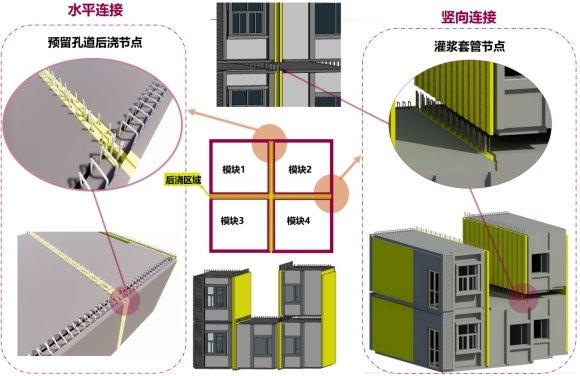 研发的RC-PPMS结构体系采用现浇剪力墙+箱式混凝土/钢模块,箱式模块可自承重,水平荷载主要由现浇剪力墙承担。该结构体系的单元水平连接通过后浇叠合板使墙、梁、板与箱体模块连成整体,竖向模块间连接采用错位套筒灌浆进行连接,保证整体结构具有足够的刚度和鲁棒性。机电管线只需在现场通过预留连接盒进行连接,管线分离设计使得后期的维护方便快捷。