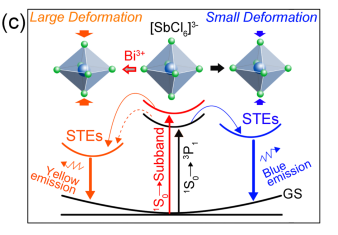 钙钛矿材料中普遍存在多个对应于不同发光波长的“自陷态”能级,若这些“自陷态”可实现同时发光将是实现高质量白光的理想材料,具有简化器件结构,色温可调,无自吸收损耗,色稳定性好等优势。然而,通常钙钛矿材料中只有一个“自陷态”能级处于发光状态,其余“自陷态”大多处于不发光的“暗态”。该体系中采用Bi3+共掺杂策略在不影响Sb3+掺杂Cs2NaInCl6基质蓝色“自陷态”发光强度的前提下,显著的增加了一个黄色“自陷态”的荧光效率,于微米级单晶中实现了高质量的可调双“自陷态”白光。Bi3+的作用在于增加了晶格畸变程度,促进了亚能级的形成过程。该研究将会为如何合适的“激活”处于“暗态”的“自陷态”能级提供新的思路。