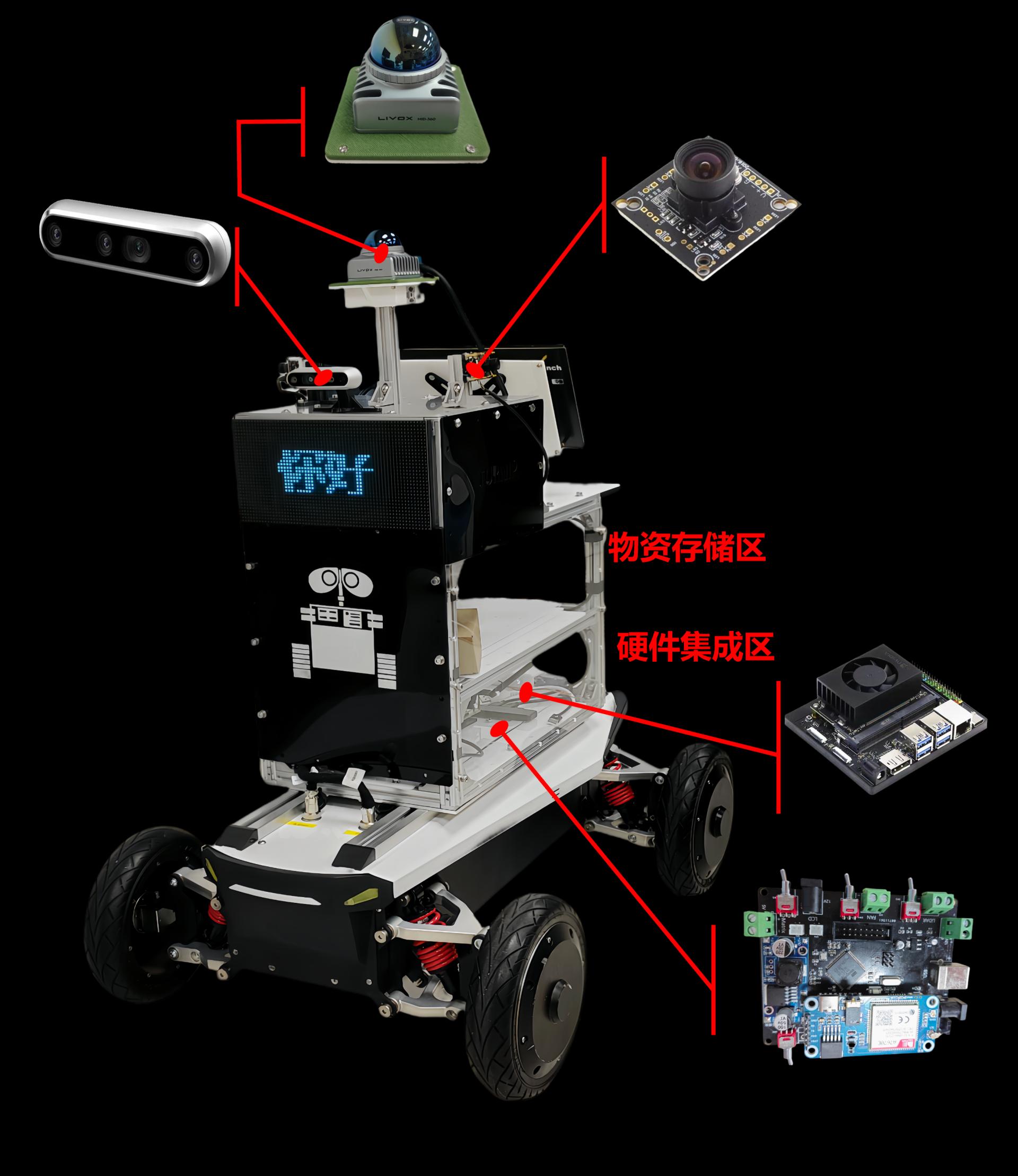 通过地图构建与自主定位导航、微信小程序等功能,在校园场景中提供物资运输、校园取件和智能巡检等服务,成为师生生活中不可缺少的帮手。