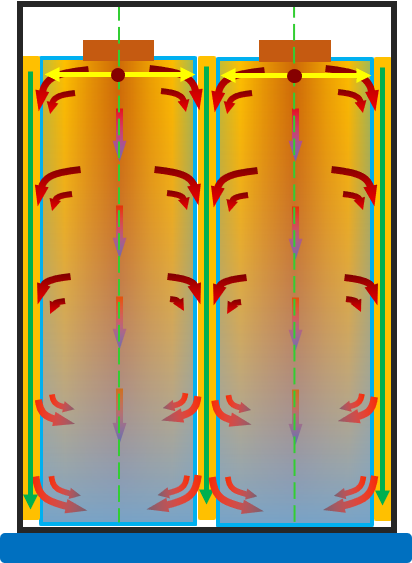 相变锂电池一体式散热技术,能够在充分保障锂电池正常工作的同时,为锂电池高热流区域和远离冷端区域提供高效的导热路径,如下图所示,左右分别为普通锂电池与相变一体式锂电池在电池工作时其温度分布与散热路径。相变器件的加入,为锂电池整体创造了新的传热与控温机制,确保锂电池在面临快充快放、过充过放、高温环境运行、电动汽车极端路面工况等条件下,其温度得到有效控制,实验测试发现:相变一体式锂电池在1C充放电循环下其上下温差能够控制在2℃以内,最高温控制在45℃的安全温度以下,且电池在3C充电过程中仍能保证良好的温控性能和容量回复。此外,相变锂电池一体式散热技术也可以应用于锂电池的低温预热启动,能够使电池在零下环境中快速预热至正常工作温度区间,从而保证锂电池的使用寿命。