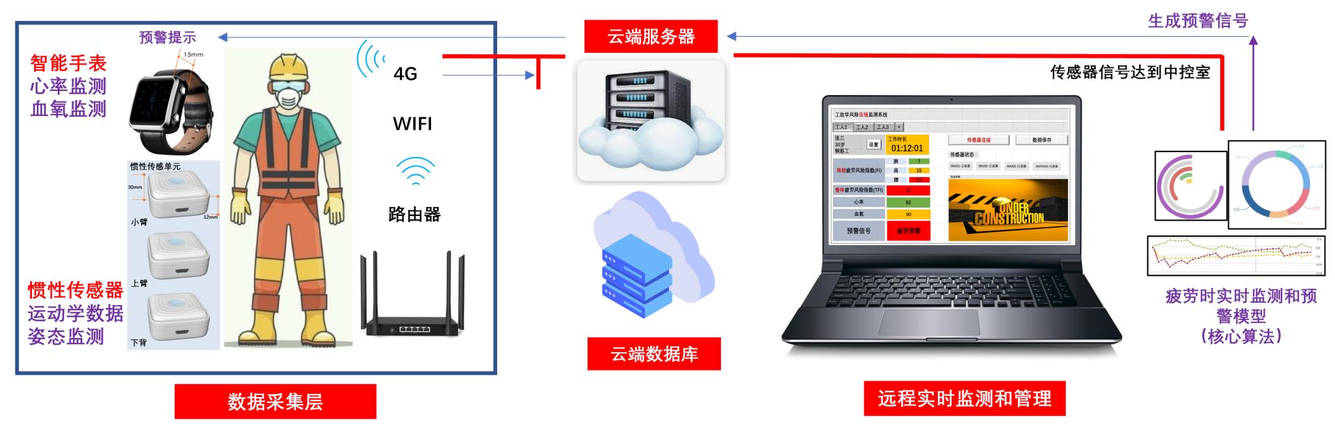 数据采集模块:通过可穿戴设备(如智能手表、可穿戴惯性传感器等)实时收集工人的生理信号和运动学数据(包括心率、体温、活动量等),并通过先进物联网技术,将信息发送到云端服务器。