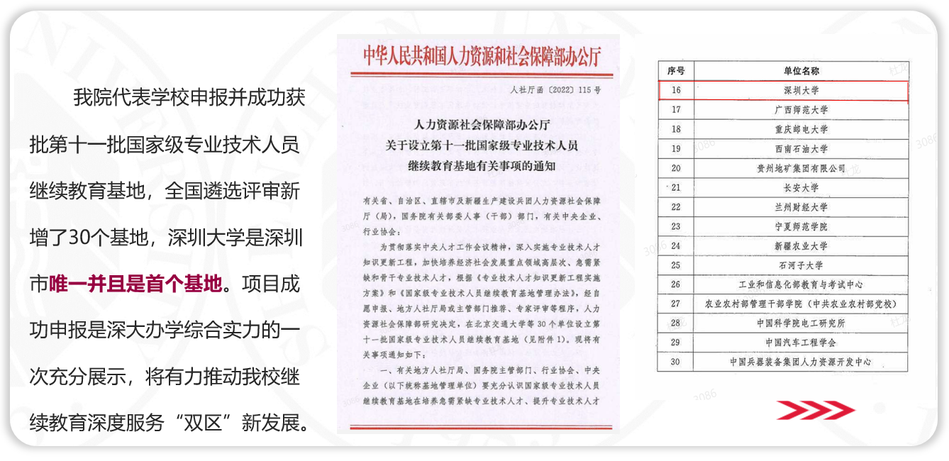 2022年8月,深圳大学成功获批国家级专业技术人员继续教育基地,是深圳市第一个也是唯一个获批单位。是国家培养培训高层次、急需紧缺和骨干专业技术人才的服务平台。依托国家级专技基地,服务全国专业技术人才培养,2023年先后举办国家级、省级、市级高级研修班。