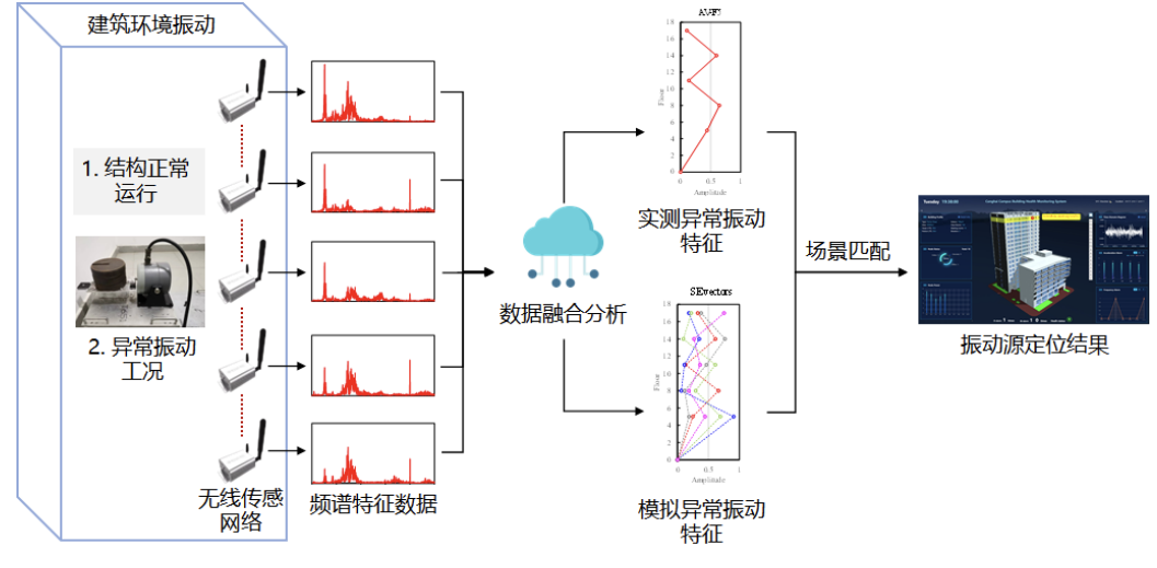 3.建筑异常振动识别与定位。将本项目提出的监测系统部署在一栋 18 层教学楼中,利用激振器在楼层中进行激振作为异常振动工况,通过提出的边云协同分析算法对异常振动进行识别与定位。试验结果表明,在 5 个不同楼层激振下的异常振动源位置均可以被准确预测。