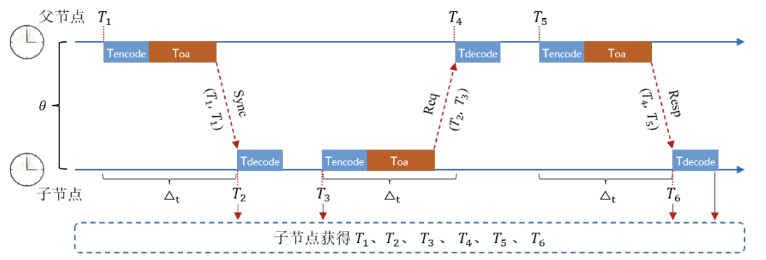 1.提出一种基于 LoRa 的无线传感网络时间同步方法。节点间采用“自上而下”、三次信息交互的方式完成一次同步通信,子节点得到 T1~T6 的时间信息,计算出与父节点的时钟差 θ,并修正本地时钟,从而同步到父节点。