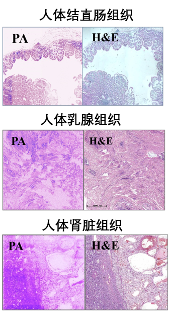 传统病理诊断需要对组织样本进行一系列必要的处理,包括:脱水、石蜡包埋、切片、染色和显微观察多个步骤,不仅耗时,而且会对样本产生不可逆的损伤,特别是在肿瘤切除手术过程中,外科医生希望能快速判断切缘位置,迫切需要能快速、准确获取病变组织的病理诊断结果。我们研发了一种应用于术中快速病理诊断的新型光声显微镜,在数分钟以内,可对新鲜组织样本进行快速、免切片、无标记的病理检测,所获得的诊断结果与传统H&E染色结果一致,为医生手术现场决策和精准设计手术方案提供了新型的诊断工具,在术后分型判断、靶向治疗等精准医疗环节具有重要的应用价值。