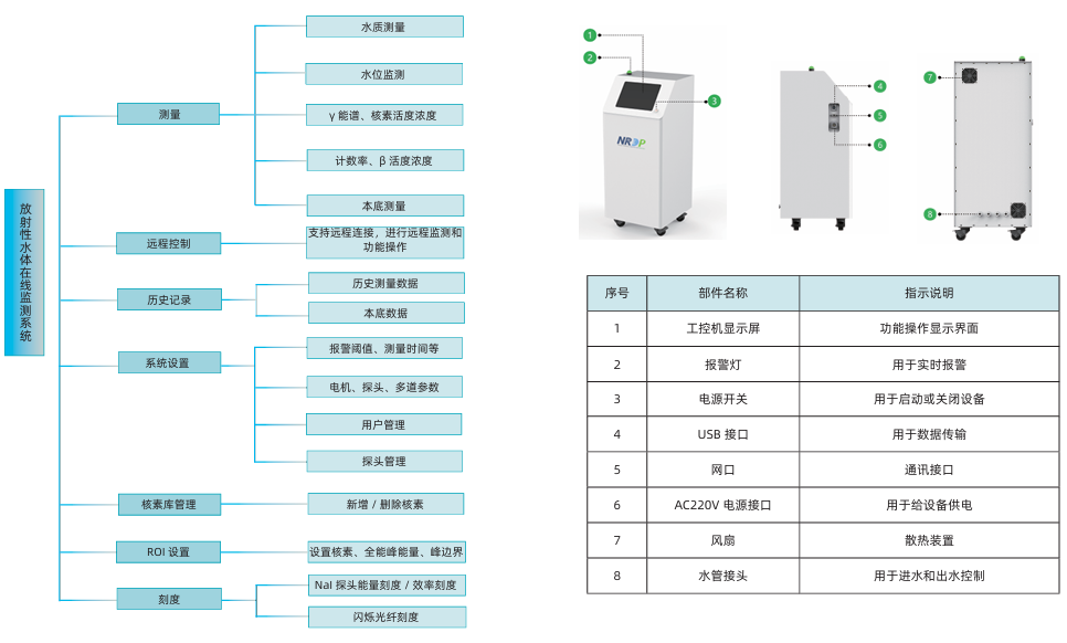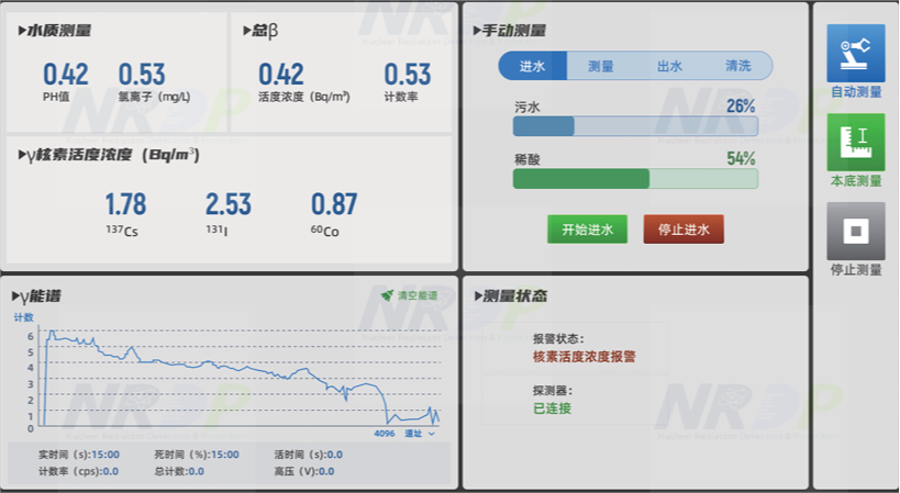 无需进行采样制样和实验室分析,直接对水体放射性进行在线监测,实时测量水中β和γ放射性核素活度浓度,具有实时显示、记录和分析测量数据等功能,并通过网络智能连接实现无人值守。