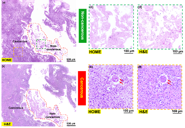 为解决传统病理切片技术样本制备繁杂、时效性低、成像速度慢,难以满足术中病理诊断需求等问题,本团队从组织内源微观成分的光学吸收、超声产生及荧光发射等生物物理特性着手,结合精密光场调控手段,操纵紫外脉冲激发光束的时空分布,同步并行采集细胞核、细胞质以及细胞外基质的超声和自发荧光信号,建立了光声和自发荧光两种先进成像技术相融合的新一代病理诊断显微镜(HOME),具备无标记观测、亚细胞级分辨率、微米级光学层析切片、以及超大光学焦深等多重能力。本团队联合多家医疗单位,开展了面向脑胶质瘤、结直肠癌和口腔肿瘤的 HOME 病理诊断研究,诊断结果显示,HOME 能够在 15 分钟内获得新鲜样本三维微观结构的无标记、免切片、高分辨成像,细胞核和细胞质等细微要素的组织图像与“金标准”H&E 染色结果高度吻合,肿瘤组织的诊断准确率达到了常规活检组织检测的水平,截至目前已累计完成100余例临床样本观测,为恶性肿瘤等重大疾病的临床术中诊疗提供变革性的影像工具。