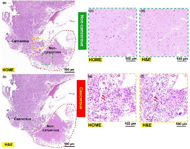 组织病理检查是肿瘤等重大疾病的临床诊断金标准,然而常规活检存在样本制造繁琐、时效性低等缺陷,难以为切缘判断等术中病理诊疗提供及时准确的诊断信息。为此,本项目提出并研发了适用于新鲜活检组织样本快速精准成像的新一代病理诊断显微镜(HOME),具备无标记、亚细胞级分辨率、微米级光学层析切片、以及超大光学焦深等多重能力。HOME 能够在 15 分钟内获得新鲜样本三维微观结构的无标记、免切片、高分辨成像,本团队联合多家医疗单位,开展了面向脑胶质瘤、结直肠癌和口腔肿瘤的 HOME 病理诊断研究,诊断结果显示,细胞核和细胞质等细微要素的组织图像与“金标准”H&E 染色结果高度吻合,肿瘤组织的诊断准确率达到了常规活检组织检测的水平,截至目前已累计完成了 100 余例临床样本观测。