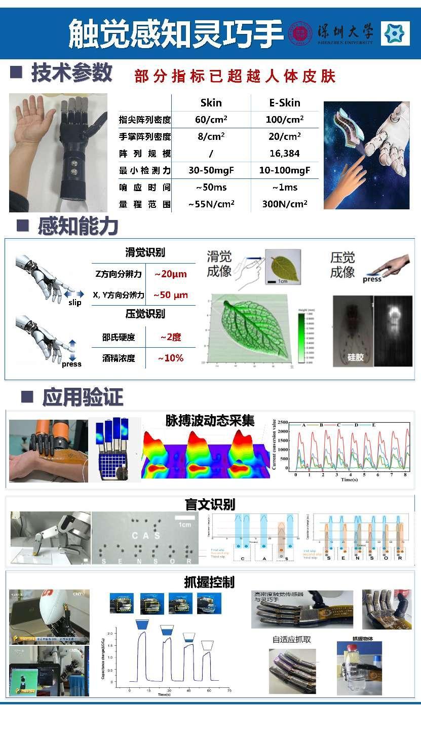 深圳大学/零感科技(深圳)有限公司柔性智能传感团队致力于碳基柔性压力传感器(电子皮肤)的研发及其产业化应用。团队提出了仿皮肤微纳力敏触点的设计方法,将三维共形碳纳米材料结合柔性无损转移技术,解决了大量程下的超灵敏和高可靠的难题,所研制的触觉传感器最小可检测1mgF,响应时间2.4 ms,已超过人体皮肤触觉感知能力。目前团队正在将该技术应用于机器人灵巧手操作及大健康监测等领域。