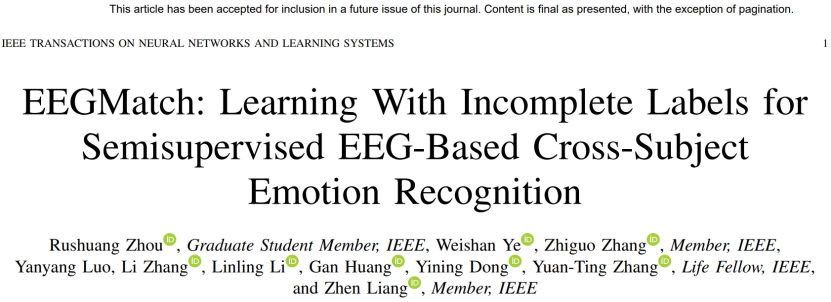 近日,医学部生物医学工程学院梁臻老师在计算机科学知名期刊IEEE Transactions on Neural Networks and Learning Systems(中科院一区TOP,影响因子10.2)上发表题为“EEGMatch: Learning with Incomplete Labels for Semi-Supervised EEG-based Cross-Subject Emotion Recognition”的论文。香港城市大学博士研究生周如双(18级深圳大学本科生)、深圳大学研究生叶炜珊和哈尔滨工业大学(深圳)张治国教授为共同第一作者,深圳大学梁臻副教授为独立通讯作者。深圳大学为第一作者单位和通讯单位。