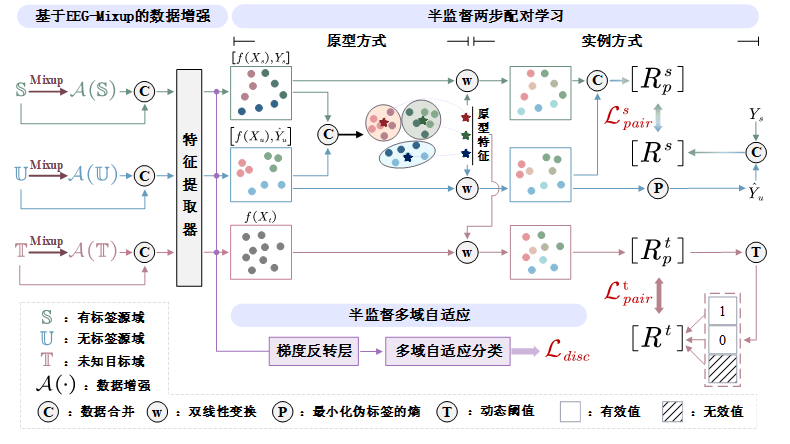 EEGMatch包含三个核心模块:(1)EEG-Mixup数据增强。我们提出了一种新的数据增强方法,通过生成更多有效样本来帮助模型训练。这种方法针对EEG信号的非平稳特性,提升了数据增强的效果,即使标签数据稀缺,也能为模型提供足够的信息。(2)半监督两步配对学习,包括原型级和实例级配对学习。原型级配对通过全局关系捕捉情绪类别特征,实例级配对则关注局部内在关系。这样可以从有限的标签数据中提取情绪的关键特征,尤其在情绪信号复杂时表现出色。(3)半监督多域自适应方法。该方法帮助对齐不同域(如有标签和无标签的数据集)之间的特征表示,减轻了分布失配问题,尤其适用于跨受试者情绪识别,提升模型的泛化能力。通过这三个创新模块,EEGMatch有效解决了EEG情绪识别中的标签稀缺问题,并能在不同受试者间准确识别情绪。