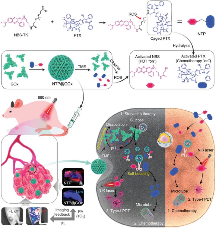 本研究开发了一种由ROS激活的异二聚体前药负载酶组装体,用于自增强程序化释放多种治疗剂,实现高效地抗肿瘤治疗。异二聚体前药NBS-TK-PTX(即NTP)由Ⅰ型PSs(NBS)、紫杉醇(PTX)和ROS响应型硫酮(TK)连接键组成。NTP与GOx有较强的亲和力,通过疏水相互作用形成NTP@GOx组装体。值得注意的是,NTP@GOx中GOx的酶活性被NTP抑制。自增强程序化释放治疗剂过程通过以下步骤实现:首先,NTP@GOx在酸性TME中部分解离,释放出一小部分NTP和GOx,并恢复GOx的酶活性;其次,GOx触发的pH降低进一步促进NTP@GOx的解离,加速了NTP和GOx的大量释放;最后,前药NTP的TK连接键被GOx催化产生的H2O2切断,加速NBS和PTX的释放。在荧光和光声双模态成像引导下,NTP@GOx组装体展现出GOx介导的饥饿治疗、PTX诱导的化疗和基于NBS的Ⅰ型光动力治疗的协同抗肿瘤疗效。