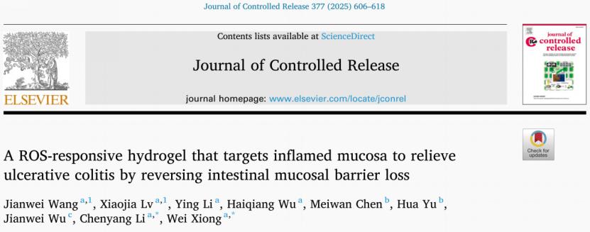 医学部药学院熊炜助理教授和李晨阳讲师合作,在抗结肠炎水凝胶研究上取得进展,成果发表在药剂学权威期刊《Journal of Controlled Release》(影响因子10.5,中科院一区,TOP期刊),题为“A ROS-responsive hydrogel that targets inflamed mucosa to relieve ulcerative colitis by reversing intestinal mucosal barrier loss”。医学部20级药学专业研究生王健伟、20级药学专业本科生吕晓佳为共同第一作者,李晨阳讲师和熊炜助理教授为共同通讯作者,深圳大学为第一通讯单位。