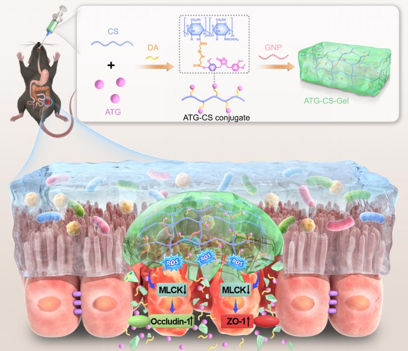肠粘膜屏障受损是溃疡性结肠炎复发的主要原因。MLCK是肠粘膜屏障受损的潜在治疗靶点。本研究合成了一种双硒键桥连的牛蒡苷元(ATG)-壳聚糖(CS)共聚物,并制成活性氧(ROS)敏感水凝胶(ATG-CS-Gel),用于靶向结肠溃疡病灶和调控MLCK。实验结果证明,ATG-CS-Gel在H2O2作用下响应释药,显著抑制Caco-2和HT-29/MTX-E12细胞的ROS产生和线粒体去极化。口服ATG-CS-Gel后粘附在结肠发炎粘膜长达24小时。在DSS诱导结肠炎小鼠模型中,与临床一线药物5-氨基水杨酸相比,ATG-CS-Gel更显著地减轻炎症症状、加速肠粘膜愈合、清除过量ROS、重塑肠道菌群,最终中取得了理想的抗结肠炎疗效。而且,实验结果表明ATG-CS-Gel通过阻断MLCK激活和上调肠细胞间紧密连接表达以逆转肠粘膜屏障的丧失。本研究证明了ATG-CS-Gel在调控MLCK修复肠粘膜屏障的潜力,其有望成为治疗溃疡性结肠炎的新策略。