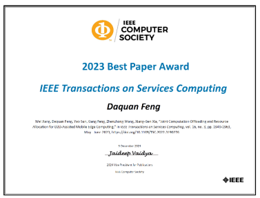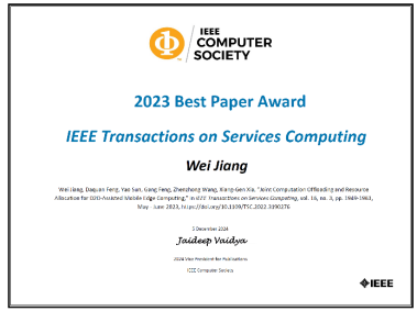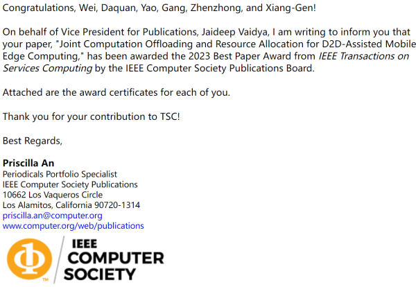 近期,收到IEEE计算机学会的通知,丁文华院士团队冯大权教授课题组发表的论文“终端协同通信辅助下的移动边缘网络联合计算与资源分配优化(Joint Computation Offloading and Resource Allocation for D2D-Assisted Mobile Edge Computing)”荣获“2023年度国际电气与电子工程师协会(IEEE)服务计算汇刊(TSC)最佳论文奖(IEEE Transactions on Services ComputingBest Paper Award)”。论文第一作者为丁文华院士指导的博士后姜微博士,通讯作者为冯大权老师。