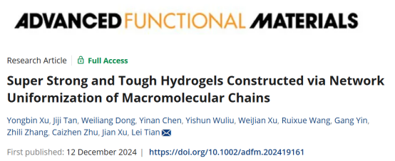 Y. Xu, J. Tan, W. Dong, Y. Chen, Y. Wuliu, W. Xu, R. Wang, G. Yin, Z. Zhang, C. Zhu, J. Xu, L. Tian, Super Strong and Tough Hydrogels Constructed via Network Uniformization of Macromolecular Chains. Adv. Funct. Mater. 2024, 2419161. https://doi.org/10.1002/adfm.202419161