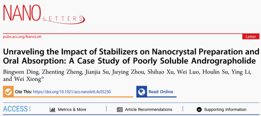 医学部药学院熊炜老师在药物纳米晶的稳定机制研究取得进展,成果发表在自然指数期刊《Nano Letters》(影响因子9.6,中科院一区),标题为“Unraveling the Impact of Stabilizers on Nanocrystal Preparation and Oral Absorption: A Case Study of Poorly Soluble Andrographolide”。医学部药学院19级药学专业本科生丁炳文和郑震庭为第一作者,熊炜助理教授为独立通讯作者,深圳大学为第一通讯单位。