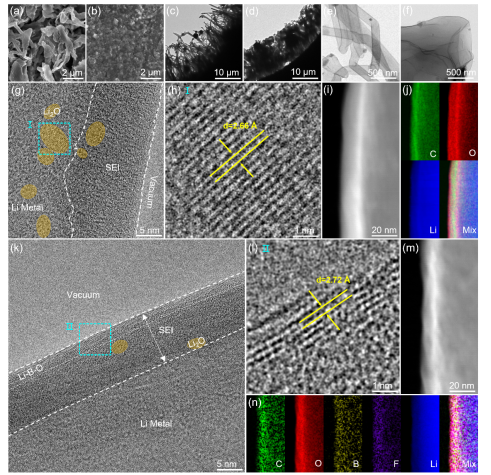 在本研究中,一种先进的电解质使用三种盐溶解在碳酸盐溶剂的组合被开发。盐阴离子主导原生溶剂化鞘层,导致Li+与溶剂之间的弱相互作用,并在原位形成富无机双层固体电解质界面(SEI)。在所设计的电解质中,具有高负载NMC阴极(约20 mg cm- 2)的LMB具有高循环稳定性,在4.5 V的截止电压下,200次循环后的容量保持率为89.89%。低温透射电镜表征(Cryo-TEM)和密度泛函理论(DFT)计算表明,硼酸盐基双层SEI具有异常致密的结构,有效地抑制了锂枝晶的生长,并证明了无机成分的连续性和致密性在SEI中起着至关重要的作用,其重要性超过了吸收和迁移能垒。这种对SEI结构的深刻理解对于推进高稳定LMB的发展具有巨大的潜力,并且可以扩展到其他电池系统。