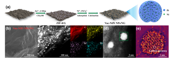 该工作以石墨烯为导电基底负载低载量铂纳米颗粒,并采用异质原子掺杂和缺陷工程策略,在铂颗粒上进行镍掺杂并且同时构建原子尺度缺陷,在铂颗粒上同时引入配体效应与应变效应。实验结果表明,配体效应提升了铂颗粒的ORR催化活性,应变效应有效提高了催化剂的及一氧化碳和甲醇的耐受性能。