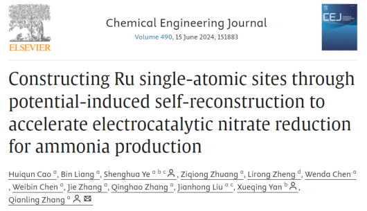 3、深圳大学张黔玲教授团队在期刊《Chemical Engineering Journal》上发表题为《Constructing Ru single-atomic sites through potential-induced self-reconstruction to accelerate electrocatalytic nitrate reduction for ammonia production》的研究论文,深圳大学曹慧群副教授和硕士研究生梁彬是共同第一作者,深圳大学叶盛华研究员、张黔玲教授和北京大学颜学庆教授为共同通讯作者。