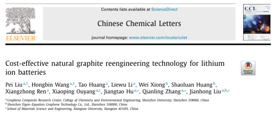 6. 深圳大学化学与环境工程学院张黔玲教授团队在材料领域顶尖期刊《Chinese Chemical Letters》(影响因子6.78,中科院JCR1区)发表了题为《Cost-effective natural graphite reengineering technology for lithium ion batteries》的研究论文。该团队硕士研究生刘珮和黄涛为论文共同第一作者,深圳大学胡江涛/张黔玲/刘剑洪教授为该论文通讯作者。