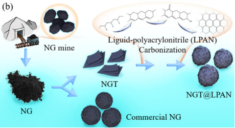 在该项工作中,开发了一种独特的多功能液态聚丙烯腈(LPAN)作为碳源,用于天然石墨(NGT)的回收。利于LPAN聚合物的多官能团结构,在一次NGT颗粒表面形成一层致密的包覆层,对碳化后的缺陷进行表面改性和修复,构建出具有低表面积/高振实密度的二次石墨颗粒。该材料在首次放电比容量(400.33mAh/g)和半电池库伦效率(92.07%)上表现出优异的电化学性能。与NMC532(Ni:Mn:Co = 5:3:2)阴极组装全电池表现出优异的循环性能,在1C电流密度下循环500圈,其容量保持率为84.32%。