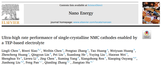 2. 深圳大学化学与环境工程学院张黔玲教授团队在材料领域顶尖期刊《Nano Energy》(影响因子16.8,中科院JCR 1区)发表了题为《Ultra-high rate performance of single-crystalline NMC cathodes enabled by a TEP-based electrolyte》的研究论文。该团队硕士研究生陈伶俐为论文第一作者,深圳大学张黔玲教授、胡江涛副教授、北京大学潘锋教授、有研(广东)新材料技术研究院肖必威教授为该论文通讯作者,深圳大学为第一作者单位和第一通讯单位。