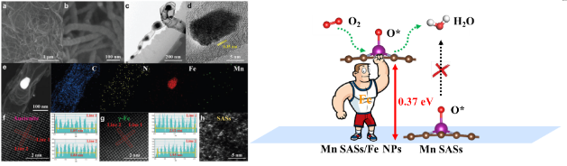 该工作合成了铁纳米颗粒@碳纳米管负载的锰、铁双单原子位点催化剂,并证明了在碳纳米管壁上的Mn单原子位点与限域在碳纳米管空腔内的铁纳米颗粒存在电子授受作用,引起Mn单原子位点的姜-泰勒畸变,激活了Mn单原子位点的ORR活性。