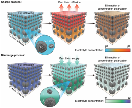 在该项工作提出了一种创新的双层电极结构设计。通过采用不同尺寸的LiNi0.83Mn0.12Co0.05O2(NMC83)材料构建双层电极结构,其中底层由大颗粒(11.3 μm),顶层由小颗粒(4.5 μm)组成,在经过充分浸润后,电极内部电解液浓度分布均匀。在充电过程中,由于锂离子扩散速度差异(VL<<VS),充电开始时小颗粒中的锂离子快速扩散到电解液中,而大颗粒中的锂离子扩散速度相对较慢。因此,电极内部形成浓度梯度,小颗粒附近的电解液中锂离子浓度高,大颗粒附近的电解液中锂离子浓度低。不过,小颗粒与电解液充分接触,根据菲克定律,高浓度的锂离子能够快速扩散到电解液中,充电过程中消除了浓差极化。这种创新的双层电极结构设计,构建了快速的电解液浸润和锂离子扩散通道,有效缓解了厚电极中的浓差极化问题。