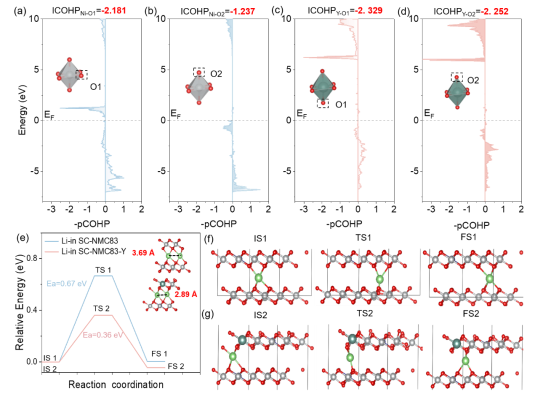 本工作通过掺杂Y元素抑制了单晶富镍层状正极材料的晶格氧释放,构建了均匀的CEI层,有效防止了循环过程中从表面到体相的严重结构降解。该技术的亮点在于掺杂Y后的SC-NMC83阴极材料通过强Y-O键稳定了结构,SC-NMC83-Y表现出更强的可逆性,并有更加均匀的CEI层。通过Y的掺入,拓宽了Li+在正极材料中的扩散路径,提高了锂离子的扩散系数,降低了锂离子的迁移能垒,成功的将锂离子的迁移能垒从0.67 eV降低至0.36 eV。其中SC-NMC83-Y的ICOHP值为-2.329,低于SC-NMC83的-2.181,表明YO6的键强强于NiO6。这项工作对Y掺杂的深入理解有助于设计出稳定的高镍单晶NMC正极材料,用于高能、高安全性锂电池。
