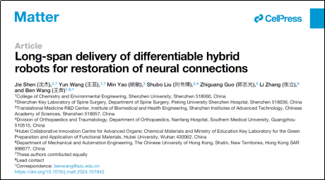 近日,深圳大学化学与环境工程学院王奔老师在医用软体机器人领域取得重要研究进展,其研究成果以题为“Long-span delivery of differentiable hybrid robots for restoration of neural connections”发表在国际顶级期刊《Matter》上。文章提出了一种基于干细胞自组装的仿生软体微型机器人,实现了在复杂脊液环境中靶向递送干细胞并促进神经连接修复,为神经损伤的微创治疗提供了全新方案。深圳大学为该论文第一完成单位,王奔老师为通讯作者,深圳大学2020级硕士研究生王芸为共同第一作者。