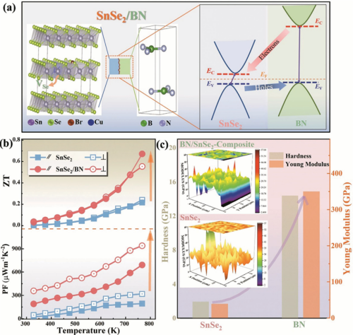 近日,深圳大学物理与光电工程学院陈跃星助理教授在Nature Index期刊《Advanced Functional Materials》上发表了题为“Integration of Boron Nitride Into Tin-Enriched SnSe2for a High-performance Thermoelectric Nanocomposite with Optimized Electrical Transport and Mechanical Properties”的研究成果。该工作首次将氮化硼(BN)引入富锡SnSe2中,制备了具有协同增强热电性能的多相复合材料,显著提升了SnSe2的热电性能,并同时改善了其机械性能。深圳大学物理与光电工程学院教师陈跃星为论文第一作者,Mohammad Nisar,罗景庭教授以及郑壮豪特聘教授为该论文共同通讯作者,深圳大学为第一通讯单位。