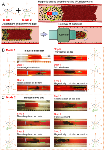 图1.两种磁驱动模态下的快速血栓脱壁剥离与碎块磁化。