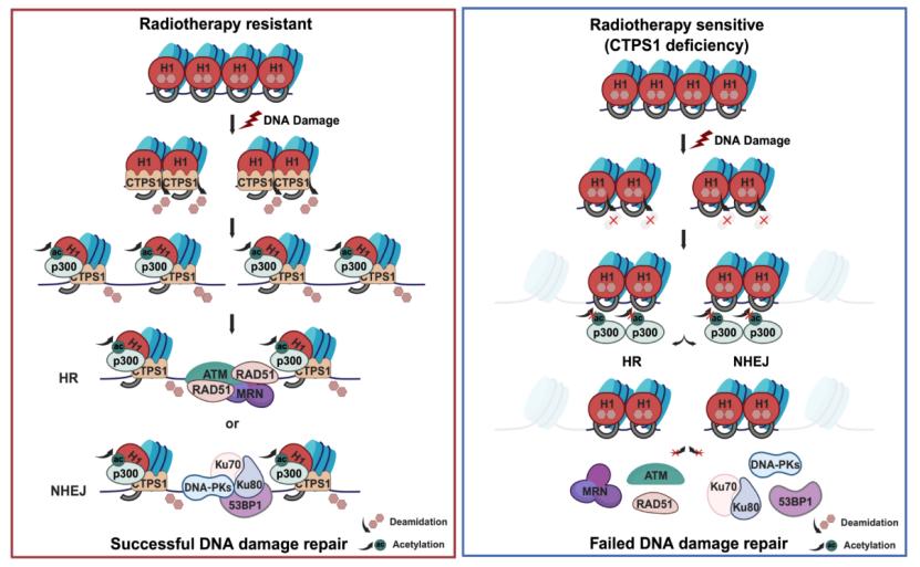 该项研究发现,连接组蛋白H1在DNA双链断裂发生后,其76和77位点的天冬酰胺残基(Asn76与Asn77)发生由CTPS1(胞嘧啶三磷酸合成酶)催化的特异性脱酰胺化,并进而促进邻近75位的赖氨酸残基(Lys75)发生乙酰化。该研究还发现组蛋白乙酰转移酶p300对脱酰胺化后的H1具有显著的底物偏好性,表明脱酰胺修饰促进了后续的乙酰化修饰事件。由于H1的75位赖氨酸是位于连接组蛋白H1的球形结构域内,也是与DNA结合的主要功能域,所以该位点的乙酰化导致了连接组蛋白H1与DNA结合力的减弱,从而引起核小体及染色质的松散并有益于招募DNA损伤修复的关键蛋白到DNA损伤位点修复断裂的DNA。这项研究提示连接组蛋白H1特异位点75位赖氨酸,76和77位的天冬酰胺可能形成一个特异的“开关”控制着染色质的松紧度。该项发现为理解染色质在细胞应激下如何动态变化提供了翔实的数据,也为肿瘤放化疗的精准靶标设计夯实了理论基础。