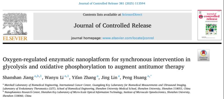 近日,深圳大学医学部生物医学工程学院黄鹏特聘教授团队以封面论文在药剂学国际权威期刊Journal of Controlled Release(影响因子10.5,中科院一区,TOP期刊)上发表了题为“Oxygen-regulated enzymatic nanoplatform for synchronous intervention in glycolysis and oxidative phosphorylation to augment antitumor therapy”的研究论文。学院博士后江珊珊和硕士研究生李婉钰为共同第一作者,黄鹏教授为通讯作者,深圳大学为独立完成单位。团队所在的生物医学工程学科属于广东省优势重点学科。