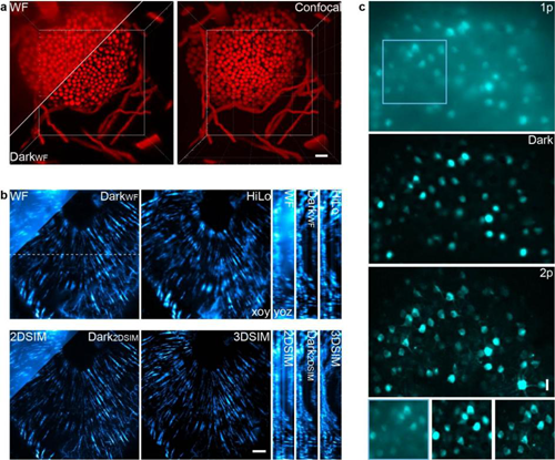 图2.交叉验证证明Dark sectioning技术的保真性能。(a)霉菌样本的宽场-共聚焦成像,(b)小鼠肾脏微丝的多模态结构光照明显微成像,(c)小鼠神经元钙成像的单光子-双光子成像。比例尺:(a, b)4 μm。