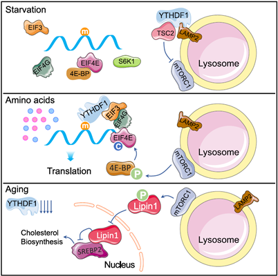 该研究发现,YTHDF1蛋白在衰老细胞和小鼠组织中显著减少,其敲除促进细胞衰老和小鼠早衰。机制上,在氨基酸饥饿条件下,YTHDF1通过溶酶体膜蛋白LAMP2B锚定TSC2复合体至溶酶体,抑制mTORC1活性——这一功能独立于其经典的m6A阅读功能。YTHDF1缺失导致mTORC1-SREBP2轴过度激活,促进胆固醇合成基因表达,进而加速衰老。抑制SREBP2表达能够有效逆转由YTHDF1缺失引发的衰老表型。该研究揭示了YTHDF1通过溶酶体定位调控mTORC1活性的非经典功能,拓展了对m6A结合蛋白多功能性的认识;阐明了"YTHDF1-mTORC1-SREBP2"这一新的衰老调控轴,为理解衰老的分子机制提供了新视角。