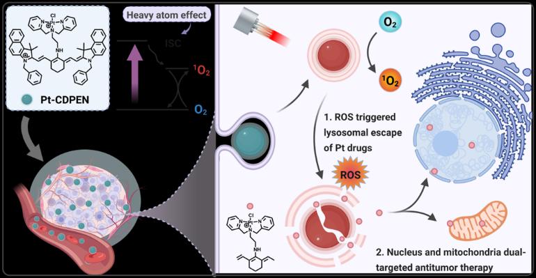 铂类化疗药物,如顺铂,是临床上广泛使用的抗肿瘤药物,但由于其高毒性和易诱发耐药性等临床瓶颈,限制了其疗效。针对上述难题,研究团队基于单功能铂配合物在降低毒副作用、逆转耐药性方面的独特优势,创新性地将光动力治疗(PDT)与之融合,成功地研发出一种光响应型单功能花菁基铂配合物(Pt-CDPEN)。该设计通过协同靶向肿瘤细胞核与线粒体的双重作用机制,实现了化疗与PDT的精准联合治疗。将铂原子作为重原子引入花菁染料母体结构,显著提升了花菁分子的单线态氧量子产率。这一分子工程策略产生双重增益效应:一方面,单线态氧生成效率的提升直接强化了PDT的抗肿瘤效能;另一方面,铂配合物的细胞摄取行为得到优化,有效促进药物从溶酶体逃逸并实现核-线粒体双重靶向蓄积。实验数据显示,相较于传统顺铂,Pt-CDPEN对耐药肿瘤细胞的杀伤效力提升达16倍,展现出突破耐药屏障的显著优势。这种自增强型铂配合物的研究成果,不仅为克服铂类药物临床局限提供了原创性解决方案,更为开发新一代低毒高效的肿瘤协同治疗体系开辟了全新路径,具有重要临床转化价值。